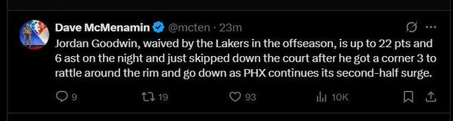 另外,NBA记者Dave McMenamin也夸赞了乔丹·古德温的表现,原文为:“乔丹·古德温在休赛期被湖人队裁掉,当晚他得到 22 分和 6 次助攻,在底角投中三分球后,他便一路冲过球场,在篮筐周围飞奔而下,凤凰城队继续在下半场发起猛攻。”