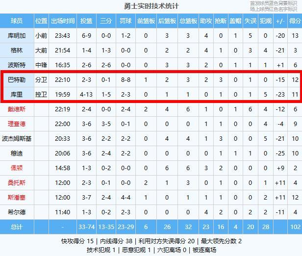头号罪人(库里):13中4得11分1篮板1抢断,正负值-23!开局一上来3中3随后各种不中,背传失误+生涯首次恶意犯规,下半场依旧毫无发挥,输球头号罪人!